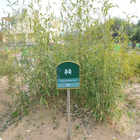 | 대의 높이는 3~4m이고 직경이 1cm 정도이며 어린 대에는 털이 없고 흰가루가 없거나 소량의 흰 가루가 있다. 죽순 껍질 가장자리는 연한 초록색이고 길이는 마디l 사이의 2/3~3/4이며 앞단과 변두리의 색상이 약간 연하며 약간 광택이 나고 밑 부분에 한 바퀴의 연한 갈색을 띤 탈락성이 있는 융모를 제외하고 다른 부분에는 털이 없다. 죽순 껍질 귀 부분과 가장자리 어구의 털이 완전하지 못하고 죽순 축은 연한 녹색이며 안으로 꺼져 들어갔고 높이는 1~2mm이다. 죽순 껍질 잎은 녹색이고 변두리가 연한 색이며 대칭 되지 않게 펼쳐졌거나 시계 반대 방향으로 돈다. 대나무 잎은 피침 형으로 길이가 12~20cm이고 넓이가 1.5~3cm이며 죽순이 자라는 시기는 5월초부터 6월 상순까지이다. 대는 잘 쪼개어 지어 물건을 묶는데 쓰이며 대는 작아 보통 통 대로 울타리를 만들거나 농작물 받침대로 쓴다. 분포 : 복건성이다. 절강성에서도 재배한다. |