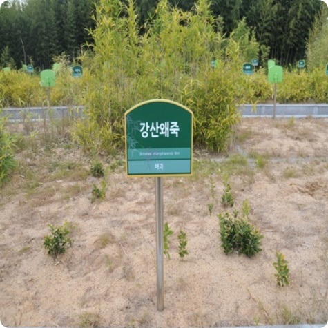 | 대의 높이는 0.5m이고 직경이 12cm이며 마디와 마디 사이의 간격이 7~12cm이고 반원형에 가깝다. 죽순 껍질 고리부분에 처음에는 가늘고 부드러운 털이 나 있으며 마디 아래에 흰 가루가 있고 오래된 대는 홍갈색을 띠며 대의 고리가 튀어나왔다. 죽순 껍질 가장자리가 처음에는 담홍색이고 흰색의 가늘고 부드러운 털이 있는데 밑 부분이 더욱 심하며 변두리에 비교적 긴 흰색의 부드러운 털이 있다. 죽순 껍질 끝부분과 털이 없고 죽순 축은 짧고 절단된 모양이며 죽순 껍질 잎은 자홍색이고 똑바로 서 있으며 망치 모양이다. 보통 잎 가장자리가 보이지 않고 잎은 알 모양이거나 삼각형의로 길이가 6~8cm이고 넓이가 1.1~2.3cm이며 밑 부분 쪽이 가장 넓고 변두리에는 긴 톱니가 있다. 녹화 관상용 대나무이다. 분포 : 절강성이다. |